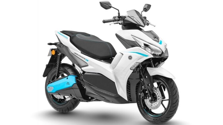 - The presented Yamaha Aerox Ecletri scooter is seen in metallic blue, silver-grey, matte black, and white colours.